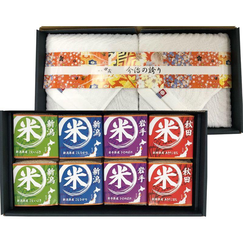 • 商品内容:新潟県産こしひかり・新潟県産こしいぶき・秋田県産あきたこまち・岩手県産ひとめぼれ(各300g)・今治産フェイスタオル(33.5×84cm)×各2