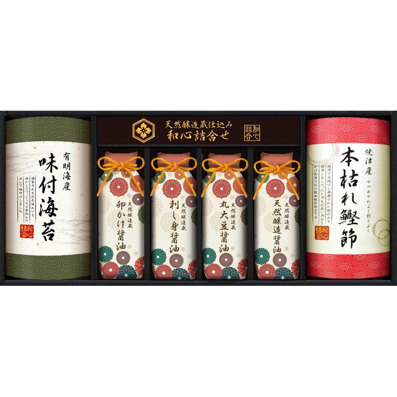 • 商品内容:有明海産味付海苔(8切8枚×2袋入)・天然醸造蔵仕込み(卵かけ醤油・刺身醤油・丸大豆醤油・天然醸造醤油)(各200ml)・本枯れ鰹節(焼津産)(17g)×各1