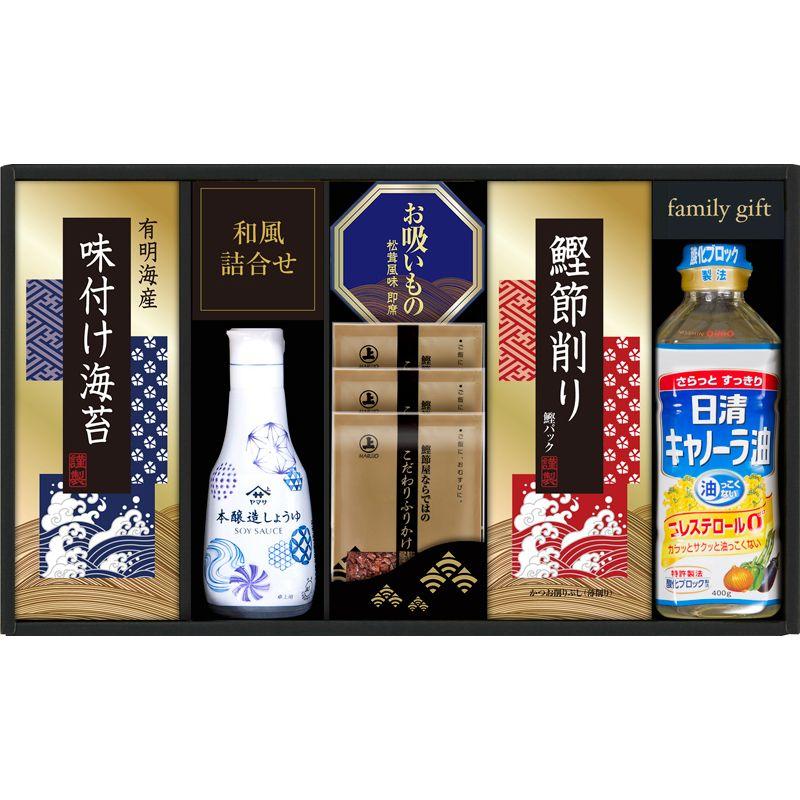 • 商品内容:こだわりふりかけ(6g)×3、日清キャノーラ油(400g)・ヤマサ鮮度卓上しょうゆ(200ml)・有明海産味付け海苔(3切6枚)・鰹節削り(2g×4袋)・永谷園お吸いもの松茸風味(2.3g×2袋)×各1