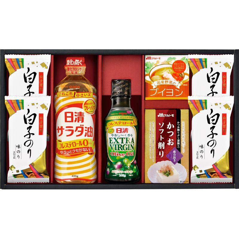 • 商品内容:白子のり味のり(8切5枚)×4、日清サラダ油(400g)・日清エキストラバージンオリーブオイル(145g)・マルトモ国産野菜のブイヨン(4g×4)・マルトモかつおソフト削り(1.5g×3)×各1
