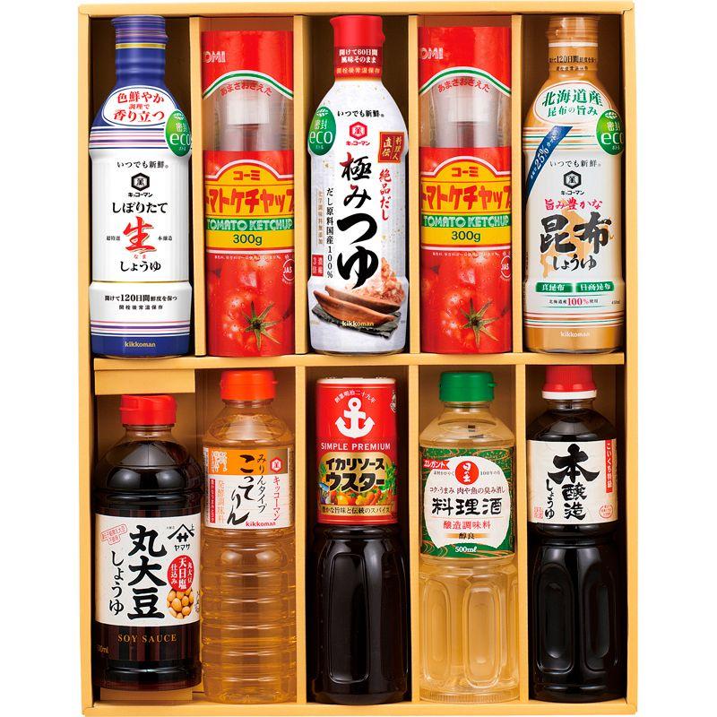 • 商品内容:コーミトマトケチャップ特級(300g)×2、ヤマサ丸大豆しょうゆ・キッコーマンみりんタイプこってりん・日の出料理酒・サンビシ本醸造しょうゆ・イカリソースウスター(各500ml)・キッコーマンいつでも新鮮(しぼりたて生しょうゆ・旨み豊かな昆布しょうゆ・料理人直伝極みつゆ)(各450ml)×各1