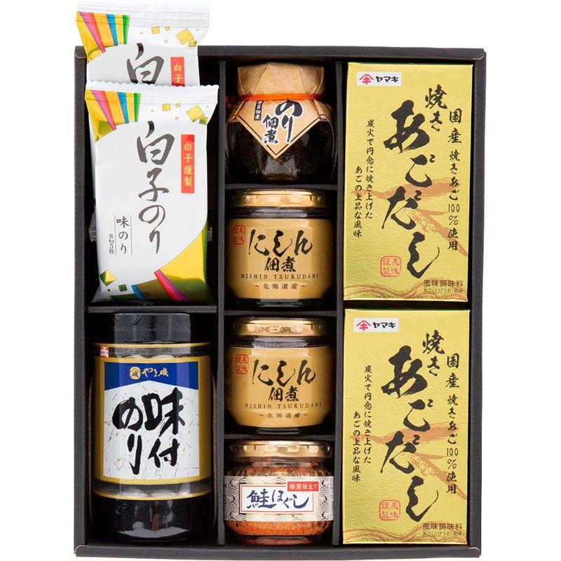 • 商品内容:北海道産にしん佃煮(45g)・ヤマキ焼きあごだし(4g×10)・白子のり味のり(8切5枚)×各2、やま磯卓上味付のり(8切32枚)・島乃香のり佃煮(80g)・オルソン鮭ほぐし(40g)×各1