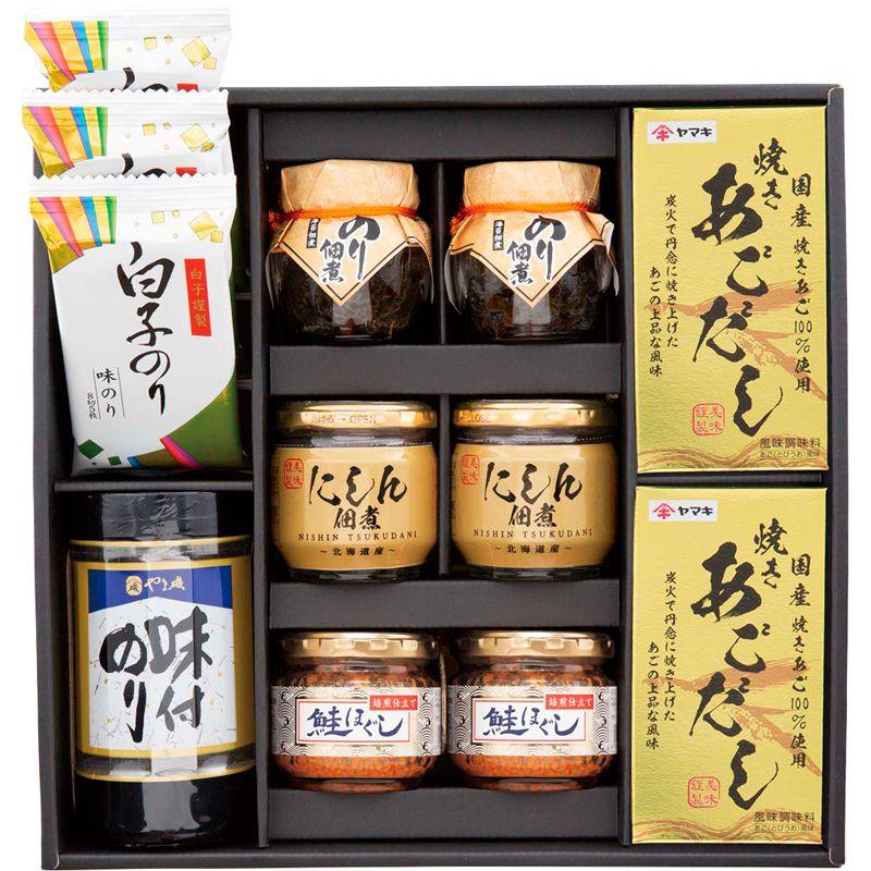 • 商品内容:白子のり味のり(8切5枚)×3、島乃香のり佃煮(80g)・北海道産にしん佃煮(45g)・オルソン鮭ほぐし(40g)・ヤマキ焼きあごだし(4g×10)×各2、やま磯卓上味付のり(8切32枚)×1