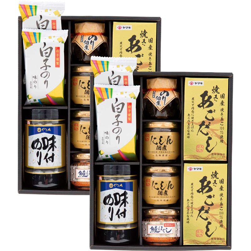 • 商品内容:北海道産にしん佃煮(45g)・ヤマキ焼きあごだし(4g×10)・白子のり味のり(8切5枚)×各4、やま磯卓上味付のり(8切32枚)・島乃香のり佃煮(80g)・オルソン鮭ほぐし(40g)×各2