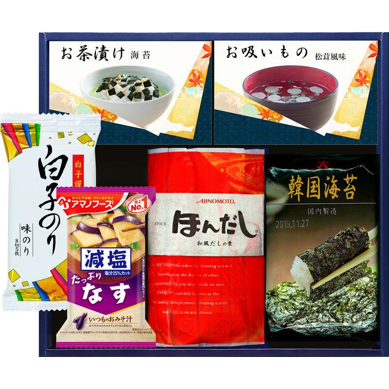 • 商品内容:味の素ほんだし(8g×7)・白子味のり(8切5枚)・アマノフーズ減塩いつものおみそ汁(なす)・永谷園お茶づけ海苔(4.7g×3)・永谷園お吸いもの松茸風味(2.3g×3)・国内製造韓国海苔(8切6枚)×各1