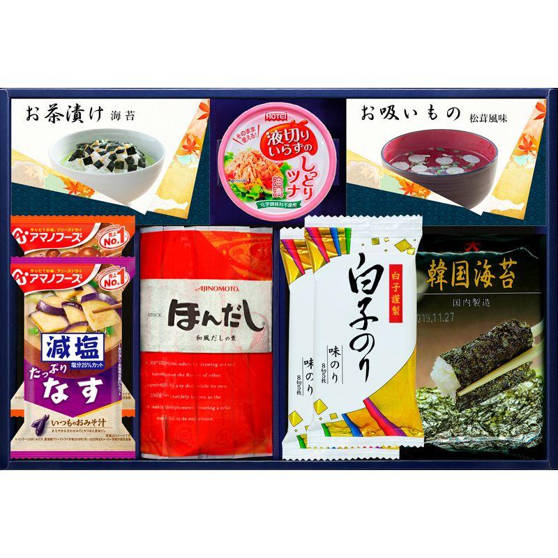 • 商品内容:白子味のり(8切5枚)×2、味の素ほんだし(8g×7)・アマノフーズ減塩いつものおみそ汁(なす・なめこ)・永谷園お茶づけ海苔(4.7g×3)・永谷園お吸いもの松茸風味(2.3g×3)・ホテイ液切りいらずのしっとりツナ油漬(55g)・国内製造韓国海苔(8切6枚)×各1