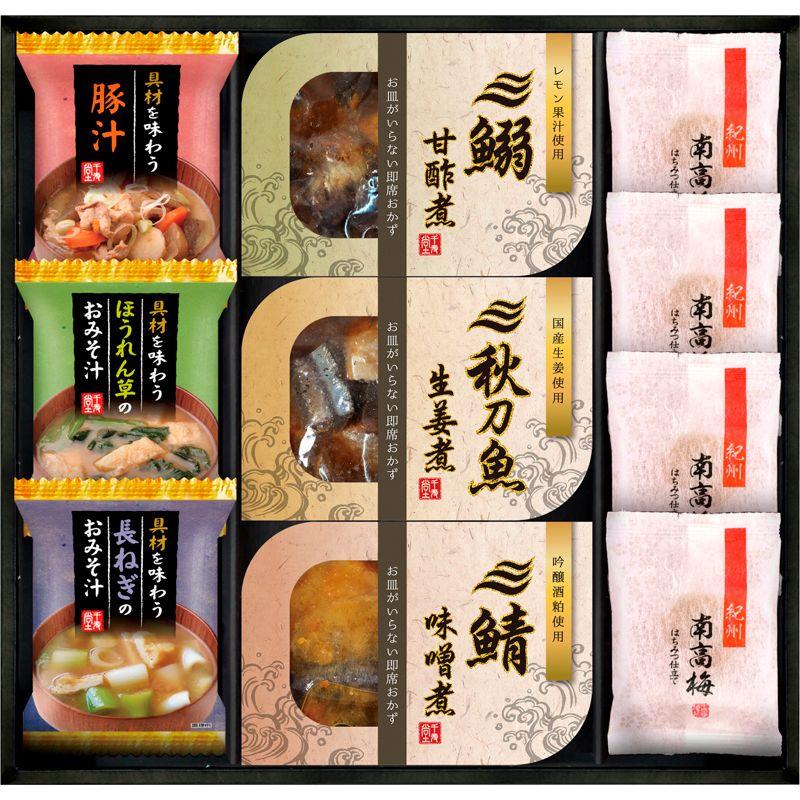 • 商品内容:紀州南高梅×4、具材を味わうおみそ汁(長ねぎ・ほうれん草・豚汁)・三陸産(鯖の味噌煮・秋刀魚の生姜煮・鰯の甘酢煮)(各100g)×各1