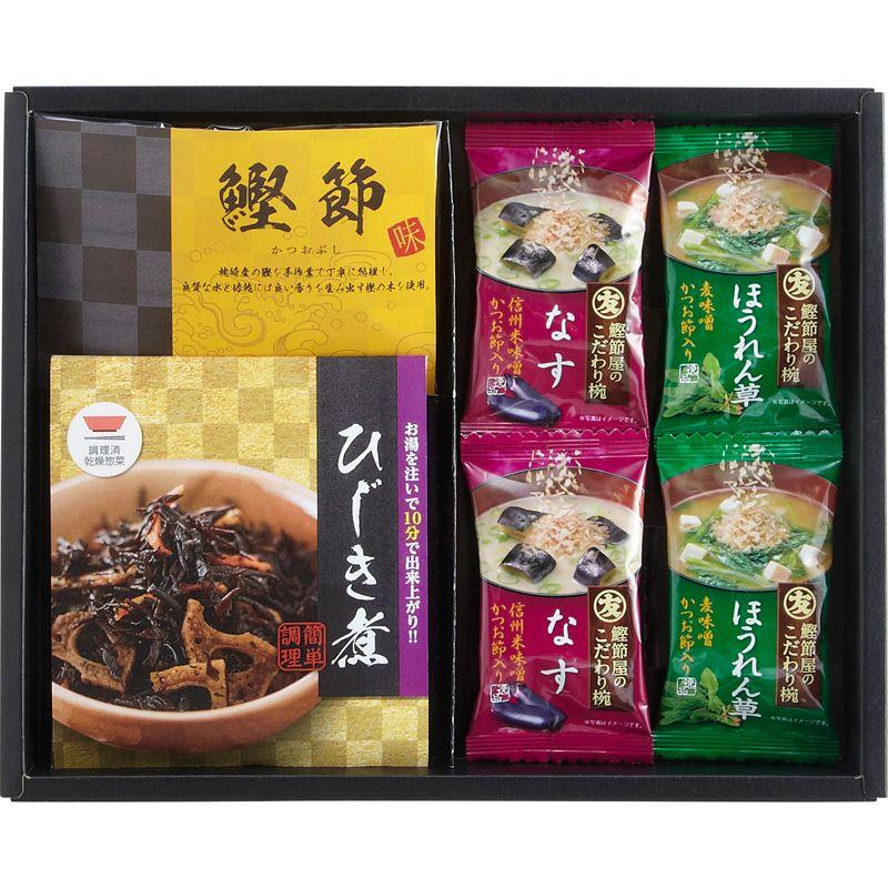 • 商品内容:即席味噌汁ほうれん草(7.5g)・即席味噌汁なす(7.4g)×各2、乾燥惣菜ひじき煮(18g)・鰹節(2g×2)×各1