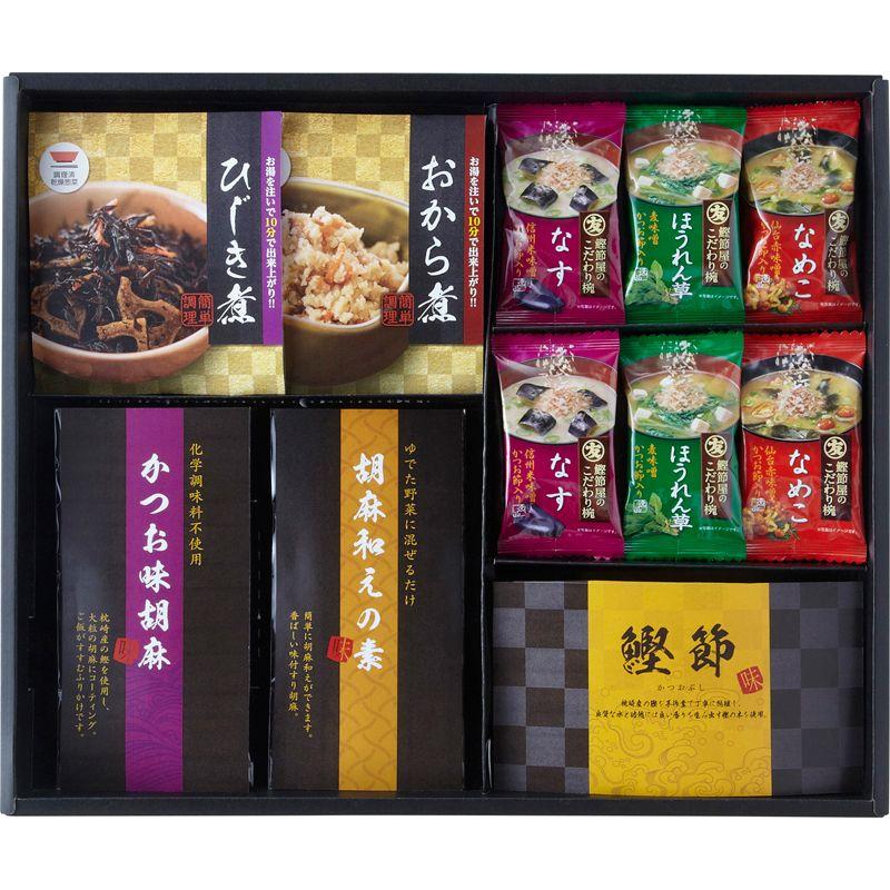 • 商品内容:即席味噌汁ほうれん草(7.5g)・即席味噌汁なす(7.4g)・即席味噌汁なめこ(5.9g)×各2、乾燥惣菜おから煮(26g)・乾燥惣菜ひじき煮(18g)・胡麻和えの素(5g×3)・かつお味胡麻(4g×3)・鰹節(2g×3)×各1