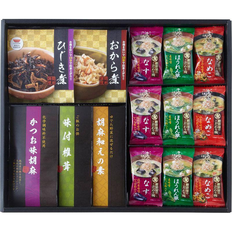 • 商品内容:即席味噌汁ほうれん草(7.5g)・即席味噌汁なす(7.4g)・即席味噌汁なめこ(5.9g)×各3、味付椎茸(60g)・乾燥惣菜おから煮(26g)・乾燥惣菜ひじき煮(18g)・胡麻和えの素(5g×3)・かつお味胡麻(4g×3)×各1
