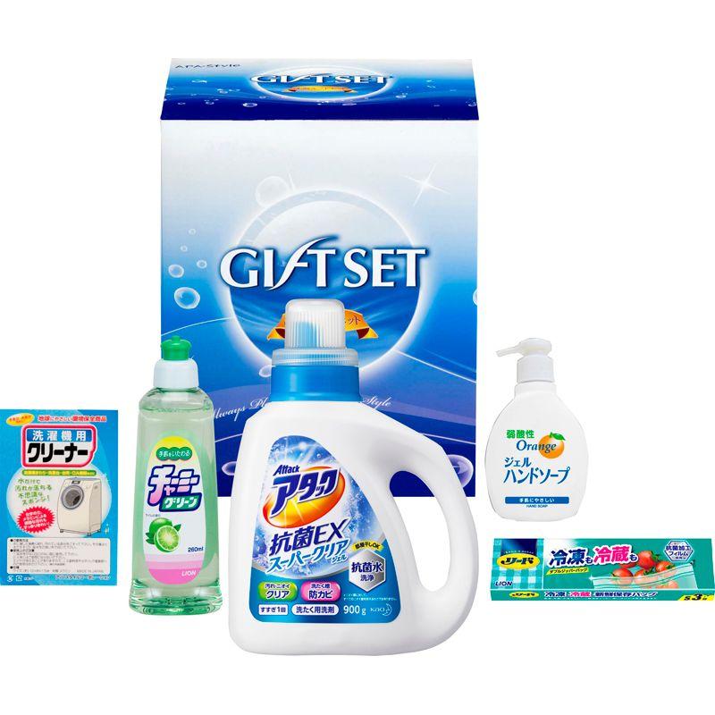 • 商品内容:花王アタック抗菌EXスーパークリアジェル(900g)・ライオンチャーミーグリーン(260ml)・オレンジジェルハンドソープ(200ml)・ライオンリード冷凍も冷蔵も新鮮保存バッグ(タイ)(S3枚)・洗濯機用クリーナーM×各1