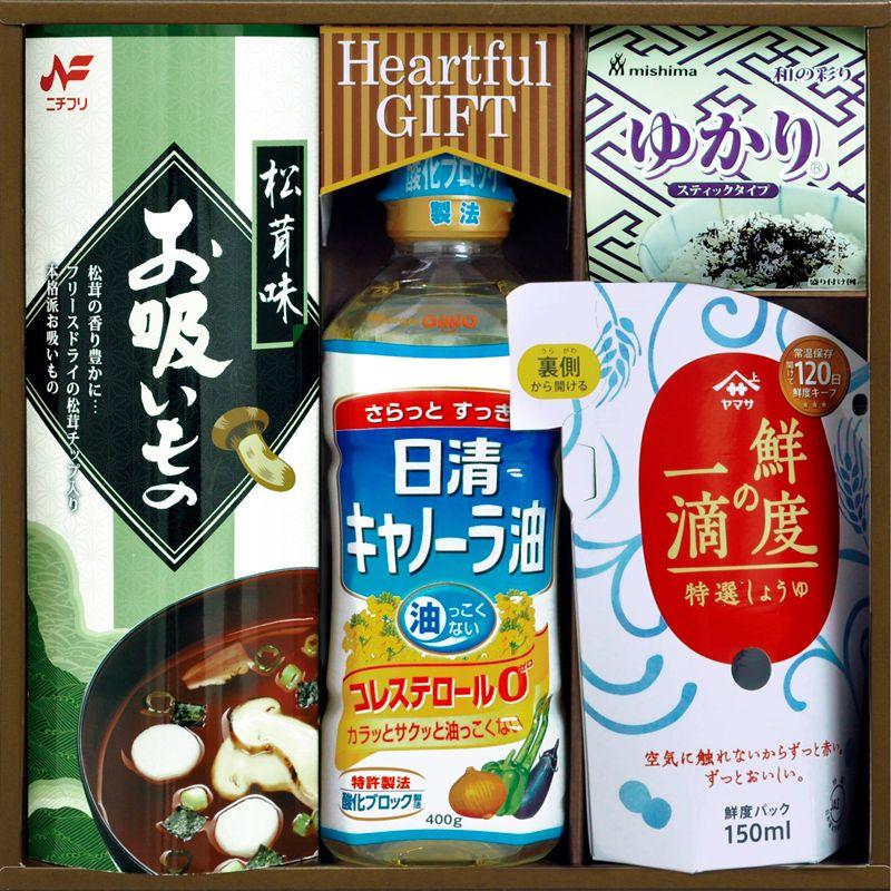 • 商品内容:日清キャノーラ油(400g)・ヤマサ鮮度の一滴しょうゆ(150ml)・三島ゆかり(1.7g×4袋)・ニチフリお吸い物松茸味(3.3g×4袋)×各1