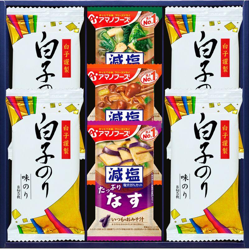 • 商品内容:白子味のり(8切5枚)×4、アマノフーズ減塩いつものおみそ汁(なす・なめこ・ほうれん草)×各1