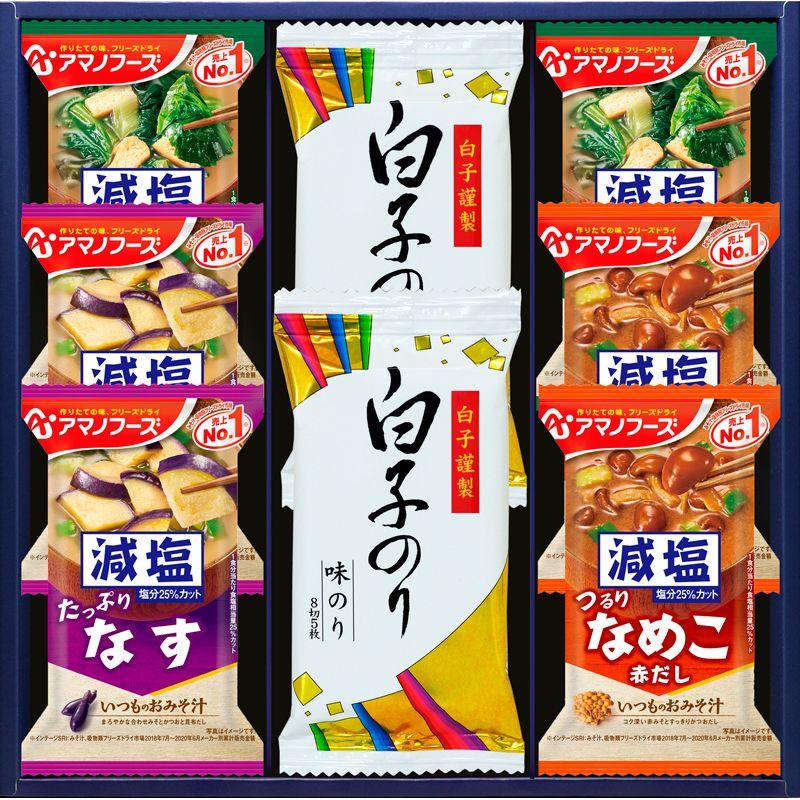 • 商品内容:白子味のり(8切5枚)・アマノフーズ減塩いつものおみそ汁(なす・なめこ・ほうれん草)×各2