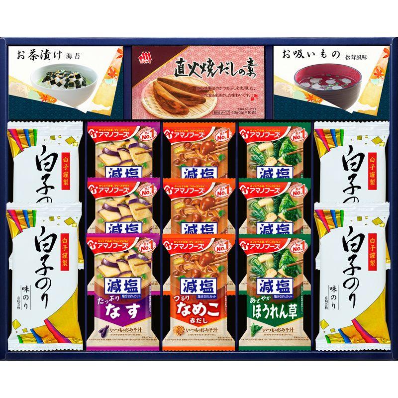 • 商品内容:白子味のり(8切5枚)×4、アマノフーズ減塩いつものおみそ汁(なす・なめこ・ほうれん草)×各3、マルトモ直火焼だしの素(4g×10)・永谷園お茶づけ海苔(4.7g×3)・永谷園お吸いもの松茸風味(2.3g×3)×各1