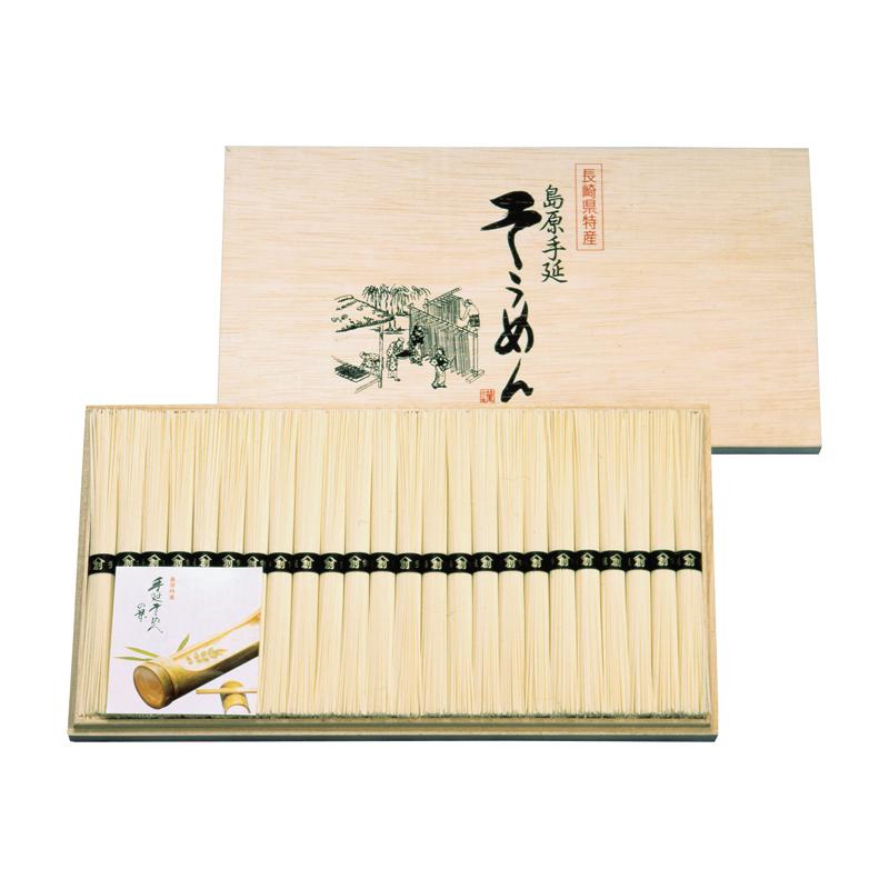 「こしの強さと風味を追求したオリジナルスレンドの小麦粉と、厳選した塩で醸し出す島原手延そうめん。そうめんの三大産地のひとつ島原のそうめんは、約四〇〇年前の島原の乱以降に移住してきた人々がそうめん作りの技を伝えたことが始まり。それ以来、全国的に有名なそうめんの名産地として知られています。そして、小麦と塩の素材と手延べの作り方にこだわり、伝統の味が今に脈々と伝わっています。そのつるつる感、独特の歯ごたえ、舌ざわり、小麦の香りは格別です。ぜひお召し上がりください。
