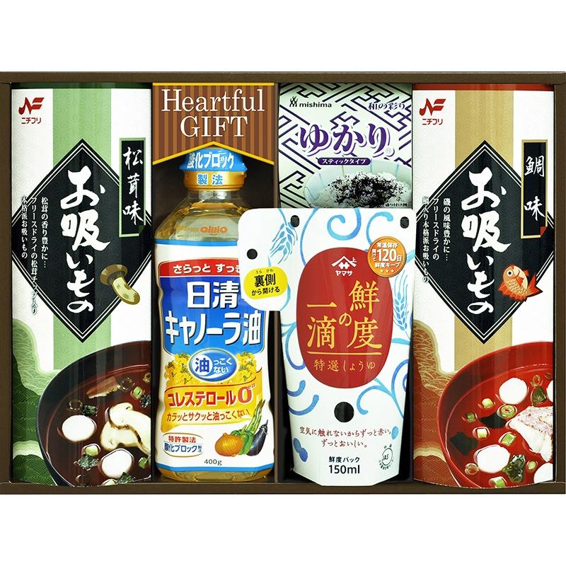 • セット内容:日清キャノーラ油(400g)・ヤマサ鮮度の一滴しょうゆ(150ml)・三島ゆかり(1.7g×4)・ニチフリお吸い物松茸味(3.3g×4)・ニチフリお吸い物鯛味(3.8g×4)×各1