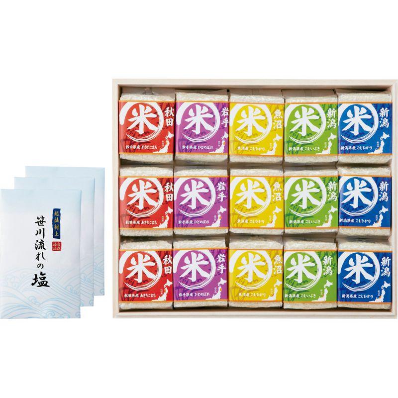 • セット内容:魚沼産こしひかり・新潟県産こしひかり・新潟県産こしいぶき・秋田県産あきたこまち・岩手県産ひとめぼれ(各300g)・元祖笹川流れの塩(80g)×各3