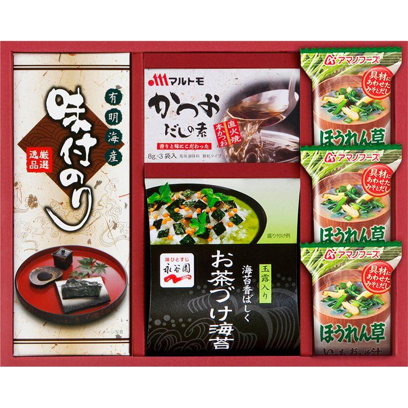 • セット内容:アマノほうれん草おみそ汁×3、有明海産味付海苔(3切6枚)・マルトモかつおだしの素(8g×3袋)・永谷園お茶づけ海苔(6.3g×3袋)×各1
