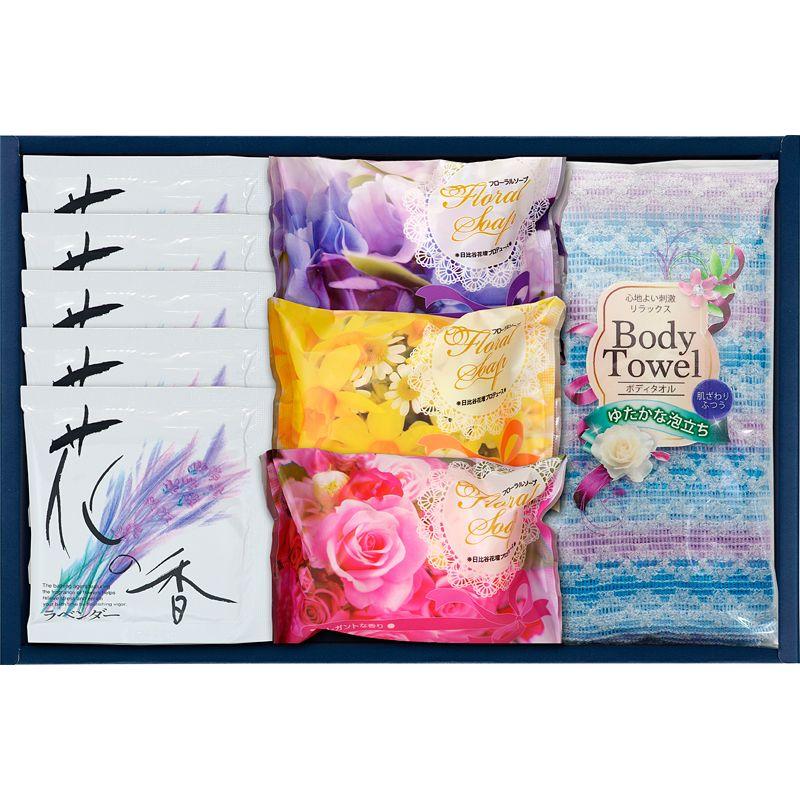 • セット内容:花の香入浴剤(25g)×5、フローラルソープ(80g)×3、ボディタオル(中国)(18×90cm)×1