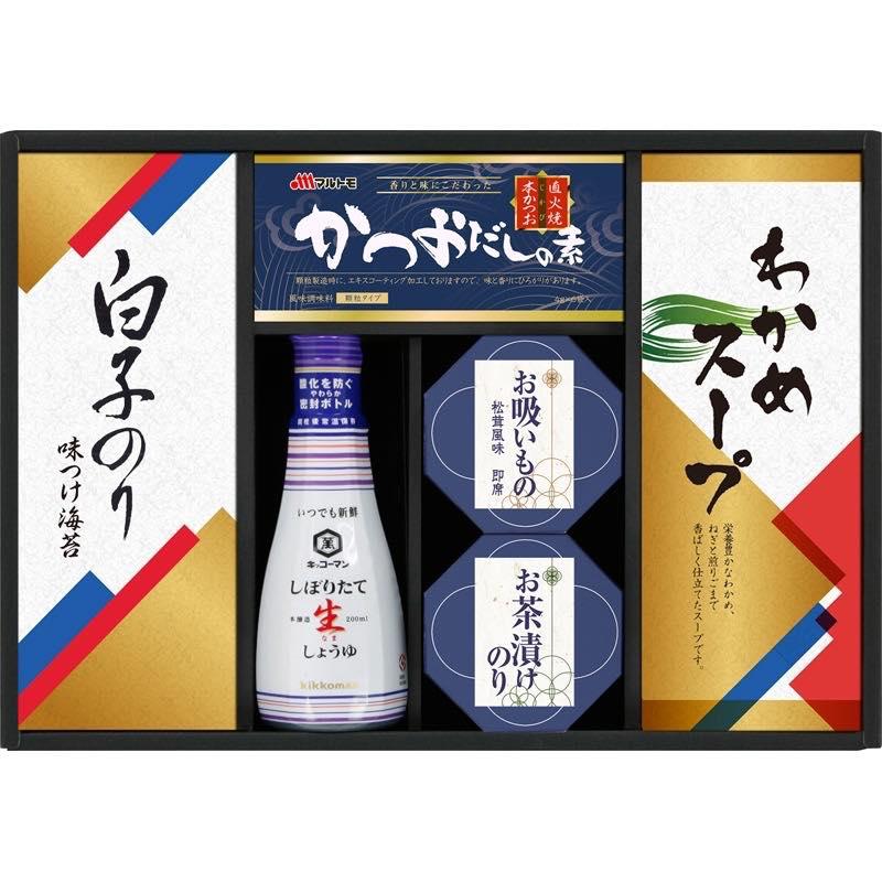 • セット内容:白子味のり(3切5枚)・マルトモかつおだしの素(4g×6袋)・永谷園お茶漬けのり(4.7g×2袋)・永谷園お吸いもの松茸風味(2.3g×2袋)・わかめスープ(5.3g×4袋)・キッコーマンしぼりたて生しょうゆ(200ml)×各1