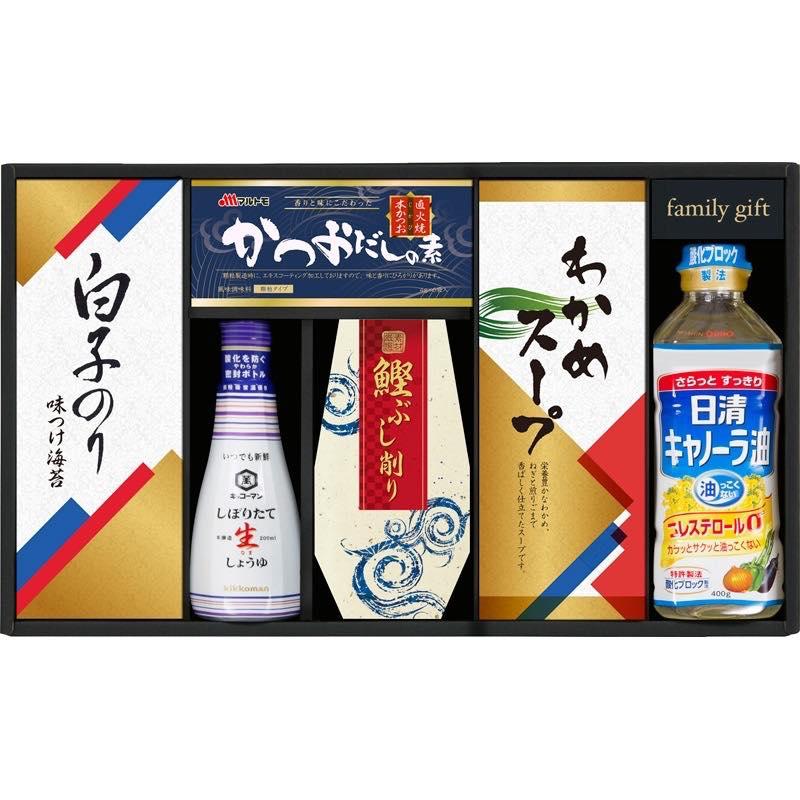 • セット内容:白子味のり(3切5枚)・マルトモかつおだしの素(4g×6袋)・キッコーマンしぼりたて生しょうゆ(200ml)・鰹ぶし削り(1.5g×3袋)・わかめスープ(5.3g×4袋)・日清キャノーラ油(400g)×各1