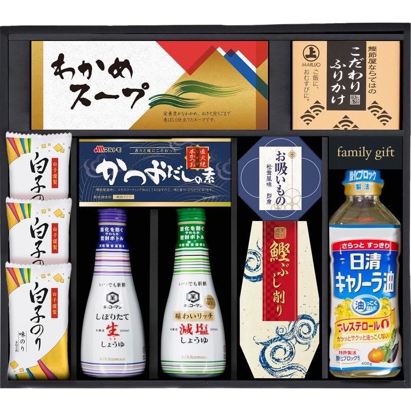 • セット内容:白子のり(8切5枚)×3、わかめスープ(5.3g×4袋)・こだわりふりかけ(6g×3袋)・マルトモかつおだしの素(4g×6袋)・キッコーマン(しぼりたて生しょうゆ・減塩しょうゆ)(各200ml)・永谷園お吸いもの松茸風味(2.3g×2袋)・鰹ぶし削り(1.5g×3袋)・日清キャノーラ油(400g)×各1