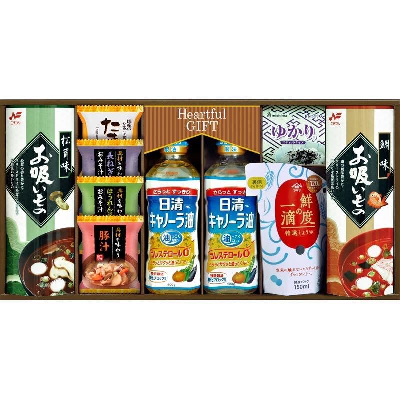• セット内容:日清キャノーラ油(400g)×2、ヤマサ鮮度の一滴しょうゆ(150ml)・三島ゆかり(1.7g×4袋)・ニチフリお吸い物松茸味(3.3g×4袋)・ニチフリお吸い物鯛味(3.8g×4袋)・宝幸おみそ汁(豚汁・ほうれん草・長ねぎ)・たまごスープ(6.4g)×各1