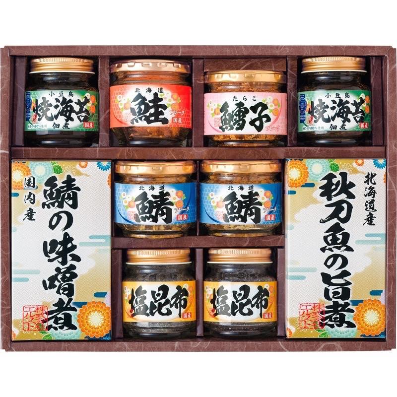 • セット内容:塩昆布(18g)・焼き海苔佃煮(85g)・北海道さば(フレーク)(40g)×各2、さんまの旨煮(95g)・さばの味噌煮(80g)・たらこ(フレーク)・北海道鮭(フレーク)(各40g)×各1
