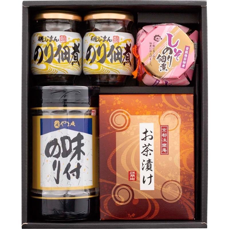 • セット内容:磯じまんのり佃煮(90g)×2、島乃香しそのり(80g)・京都洙樂庵お茶漬けの素(宇治抹茶味・だししょう油味)(各5.3g×2袋)・やま磯卓上味付けのり(8切32枚)×各1