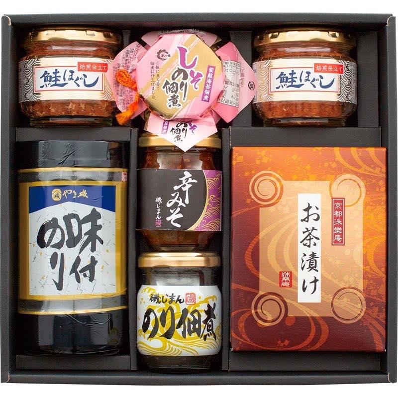 • セット内容:オルソン鮭ほぐし(35g)×2、磯じまんのり佃煮(90g)・磯じまん辛みそ(95g)・島乃香しそのり(80g)・京都洙樂庵お茶漬けの素(宇治抹茶味・だししょう油味)(各5.3g×2袋)・やま磯卓上味付けのり(8切32枚)×各1