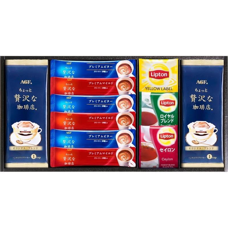 • セット内容:AGFちょっと贅沢な珈琲店オリジナルブレンド(8g)×4、AGFちょっと贅沢な珈琲店(プレミアムビター・プレミアムマイルド)(各7g)×各3、リプトン イエローラベルアルミティーバッグ(2g)・リプトン(ロイヤルブレンドアルミティーバッグ・セイロンアルミティーバッグ)(各2.2g)×各2