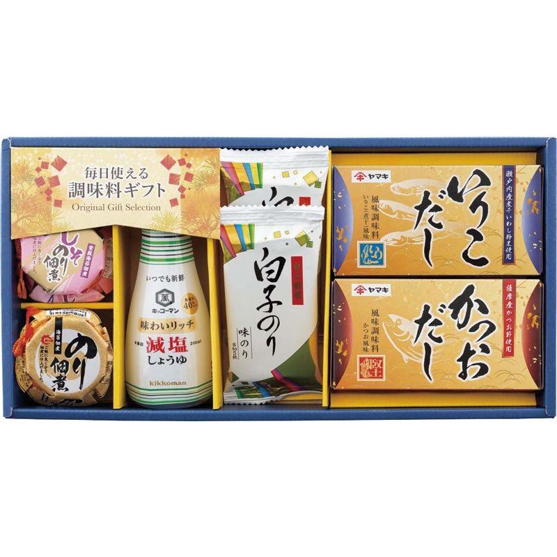 • 商品内容:白子のり味のり(8切5枚)×2、ヤマキ(いりこだし・かつおだし)(各4g×10)・キッコーマンいつでも新鮮味わいリッチ減塩しょうゆ(200ml)・島乃香(のり佃煮・しそのり)(各80g)×各1