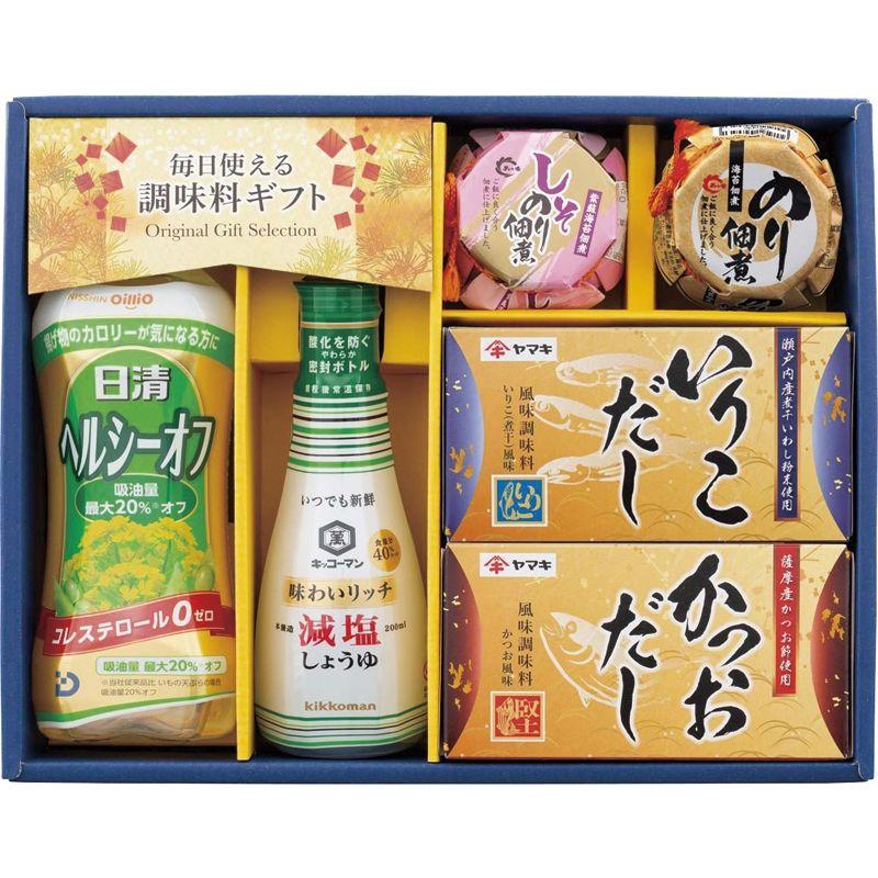 • 商品内容:ヤマキ(いりこだし・かつおだし)(各4g×10)・キッコーマンいつでも新鮮味わいリッチ減塩しょうゆ(200ml)・島乃香(のり佃煮・しそのり)(各80g)・日清ヘルシーオフ(350g)×各1