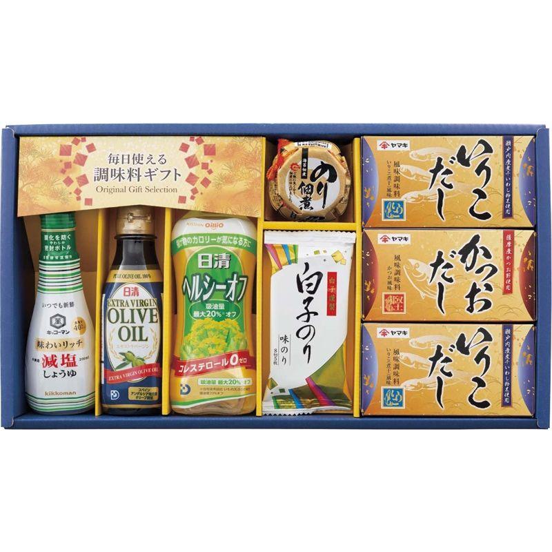 • 商品内容:ヤマキいりこだし(4g×10)×2、ヤマキかつおだし(4g×10)・キッコーマンいつでも新鮮味わいリッチ減塩しょうゆ(200ml)・島乃香のり佃煮(80g)・日清ヘルシーオフ(350g)・白子のり味のり(8切5枚)・日清エキストラバージンオリーブオイル(200g)×各1