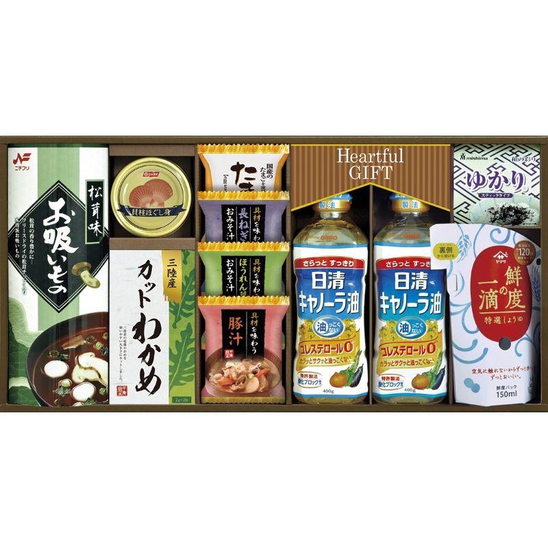 • 商品内容:日清キャノーラ油(400g)×2、ヤマサ鮮度の一滴しょうゆ(150ml)・三島ゆかり(1.7g×4袋)・ニチフリお吸い物松茸味(3.3g×4袋)・国産カットわかめ(2g×2袋)・具材を味わうおみそ汁(ほうれん草・長ねぎ)・具材を味わう豚汁・たまごスープ(6.4g)・ニッスイ貝柱ほぐし身(70g)×各1