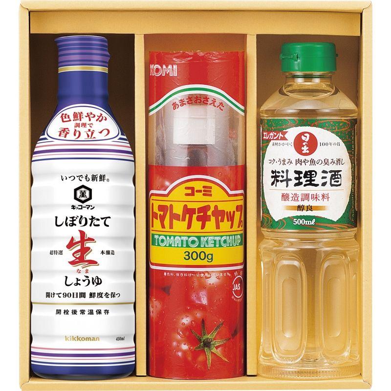 • 商品内容:キッコーマンいつでも新鮮しぼりたて生しょうゆ(450ml)・日の出料理酒(500ml)・コーミトマトケチャップ特級(300g)×各1