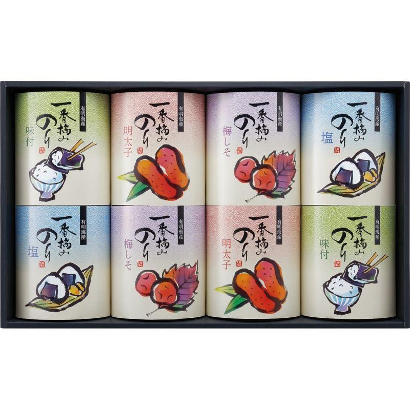 栄養素が豊富な有明海の漁場で今年初めて摘み取られた貴重な海苔「一番摘み海苔」。味付、梅しそ、しお、明太子の4種類のフレーバーをセットしました。一番摘みならではの柔らかく風味豊かでパリッとした食感と口どけの良さが特徴的な美味しい海苔の詰合せです。